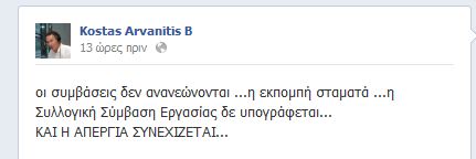 Συγκεκριμένα, ο Κώστας Αρβανίτης έγραψε τα εξής: “Οι συμβάσεις δεν ανανεώνονται… Η εκπομπή σταματά… Η Συλλογική Σύμβαση Εργασίας δεν υπογράφεται… και η απεργία συνεχίζεται”.