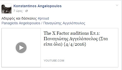 Μάλιστα, ο Κωνσταντίνος «ανέβασε» στη σελίδα του στο Facebook την εμφάνιση του Παναγιώτη, υπό τη λεζάντα «αδερφός και δάσκαλος», δηλώνοντας περήφανος για εκείνον!