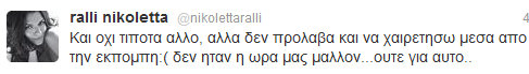 Σήμερα, λόγω της απεργίας των τεχνικών δεν υπάρχει κανένα ζωντανό πρόγραμμα…Η Νικολέττα Ράλλη δεν πρόλαβε να αποχαιρετήσει τους τηλεθεατές της. Έγραψε στο twitter της κάτι που μοιάζει με παράπονο: