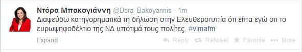 «Διαψεύδω κατηγορηματικά τη δήλωση στην Ελευθεροτυπία ότι είπα εγώ ότι το ευρωψηφοδέλτιο της ΝΔ υποτιμά τους πολίτες» έγραψε η κ. Μπακογιάννη στον προσωπικό της λογαριασμό στο twitter.
