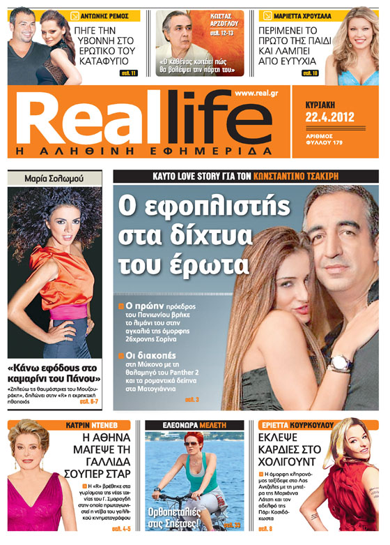 “Ο εφοπλιστής στα δίχτυα του έρωτα”, είναι ο τίτλος του Real Life. Στο ένθετο θα βρείτε για τί η Μαρία Σολωμού “κάνει εφόδους στο καμαρίνι του Πάνου Μουζουράκη” Που “πήγε την Υβόννη” ο Αντώνης Ρέμος “Ο καθένας κοιτάει πως θα βολέψει την πάρτη του” ο τίτλος της συνέντευξης του Κώστα Αρζόγλου Η Μαριέττα Χρουσαλά που περιμένει το πρώτο της παιδί και λάμπει από ευτυχίααλλά και πως η Αθήνα “μάγεψε” τη Γαλλίδα σούπερ σταρ Κατρίν Ντενέβ Την Ελεονώρα Μελέτη να κάνει ορθοπεταλιές στις Σπέτσες και την Εριέττα Κούρκουλου που “έκλεψε καρδιές στο Χόλιγουντ”