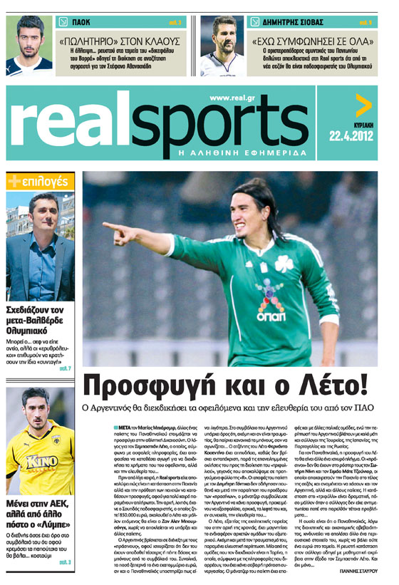 “Προσφυγή και ο Λέτο!” Ο Αργεντινός θα διεκδικήσει τα οφειλόμενα και την ελευθερία του από τον ΠΑΟ, είναι το βασικό θέμα του Real Sports. Στο αθλητικό ένθετο της REAL NEWS θα διαβάσετεπως σχεδιάζουν στον Ολυμπιακό την μετά-Βαλβέρδε εποχήπου θα πάει ο αριστεροπόδαρος αμυντικός του Πανιωνίου Δημήτρης Σιόβας Γιατί ο ΠΑΟΚ ετοιμάζεται να πουλήσει τον Στέφανο Αθανασιάδη Σε ποιο πόστο στην ΑΕΚ θα βρεθεί ο Νίκος Λυμπερόπουλος