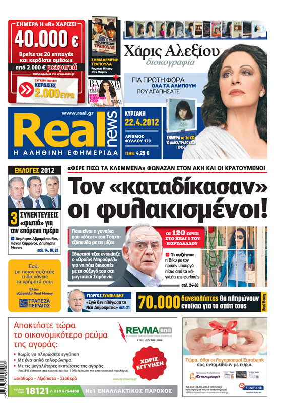 Η REAL NEWS χαρίζει 40.000 ευρώ! Βρείτε τις 20 επιταγές και κερδίστε αμέσως από 2.000 ευρώ μετρητά. Χάρις Αλεξίου, για πρώτη φορά σε εφημερίδα, όλα τα άλμπουμ που αγαπήσατε. Αυτή την Κυριακή το πρώτο cd με 10 λαϊκά τραγούδια του 1975.Φοβερό γουέστερν με τους Ρόμπερτ Μίτσαμ και Ντιν Μάρτιν, αλλά και το γυναικείο περιοδικό Harper’s BAZAAR. Με τίτλο : Τον “καταδίκασαν”οι φυλακισμένοι , η REAL NEWS αποκαλύπτει τι φώναζαν οι κρατούμενοι στον Άκη Τσοχατζόπουλο αλλά και όλο το παρασκήνιο από τις συζητήσεις με την σύζυγό του και τις “ακριβές” διακοπές με ιδιωτικό τζετ. Διαβάστε τι δηλώνει ο Γιώργος Συμπιλίδης για τη Νέα Δημοκρατία,τι λένε στις συνεντεύξεις τους ο Δημήτρης Αβραμόπουλος, ο Πάνος Καμμένος και ο Δημήτρης Ρέππας.Μεγάλη αποκάλυψη :70.000 δανειολήπτες θα πληρώνουν ενοίκιο για το σπίτι τους