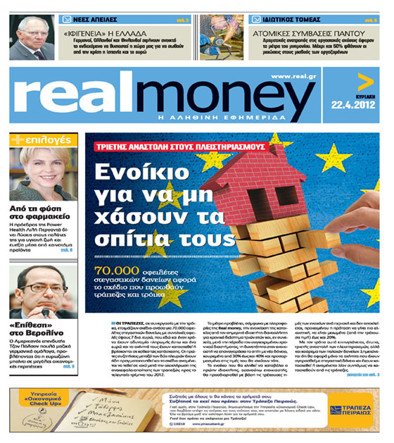 “Ενοίκιο για να μη χάσουν τα σπίτια τους” είναι ο τίτλος του αποκαλυπτικού ρεπορτάζ που θα συζητηθεί του Real Money. Στο ένθετο της REAL NEWS θα διαβάσετε ποιοι απειλούν να κάνουν “Ιφιγένεια” την Ελλάδα Τις ανατροπές στις εργασιακές σχέσεις στον ιδιωτικό τομέα Από τη φύση στο φαρμακείο : Η πρόεδρος της Power Health Λιλή Περγαντά δίνει λύσεις στους πελάτες της για υγιεινή ζωή και ευεξία μέσα από καινοτόμα προιόντα.”Επίθεση” στο Βερολίνο: Ο Αμερικανός επενδυτής Τζον Πόλσον πουλά μαζικά γερμανικά ομόλογα ,προβλέποντας ότι η ευρωζώνη μπαίνει σε μεγάλες οικονομικές περιπέτειες.