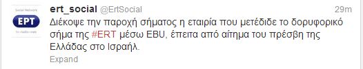 «Διέκοψε την παροχή σήματος η εταιρία που μετέδιδε το δορυφορικό σήμα της ΕΡΤ μέσω της EBU -και η οποία εδρεύει στο Ισραήλ- έπειτα από αίτημα του πρέσβη της Ελλάδας στο Ισραήλ.»