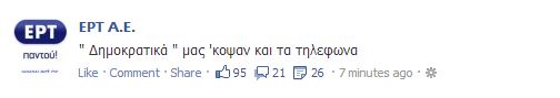 Με αυτή τη λιτή ανάρτηση στο facebook, οι εργαζόμενοι της ΕΡΤ, ενημερώνουν για την διακοπή της λειτουργίας των τηλεφωνικών γραμμών.