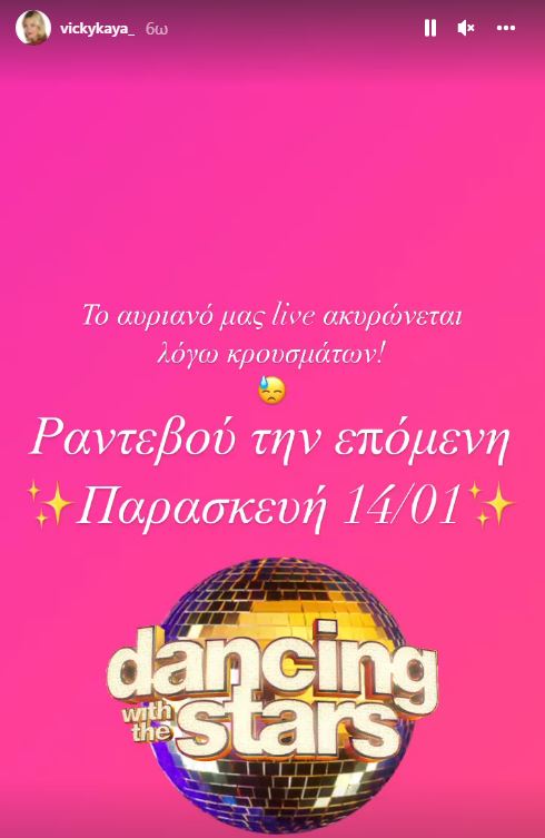 Το DWTS δεν θα βγει απόψε στον αέρα. Την δυσάρεστη εξέλιξη ανακοίνωσε η Βίκυ Καγιά μέσα από τον λογαριασμό της στο Instagram. O λόγος είναι ο κορονοϊός και τα κρούσματα που βρέθηκαν στο σόου.