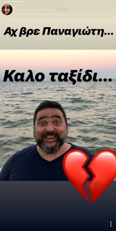 Δύσκολες στιγμές περνά η Βασιλική Ανδρίτσου.Η ηθοποιός πληροφορήθηκε για το θάνατο ενός καλού της φίλου.Ο φίλος της, ο Παναγιώτης έφυγε ξαφνικά από τη ζωή και η ίδια ενημέρωσε τους διαδικτυακούς της φίλους μέσα από ένα instastory, που δημοσίευσε.Η Βασιλική Ανδρίτσου πόσταρε μία τρυφερή φωτογραφία και έγραψε: «Αχ βρε Παναγιώτη. Καλό ταξίδι» συνοδεύοντας την ανάρτησή της με μια ραγισμένη καρδιάΔείτε τη φωτογραφία: