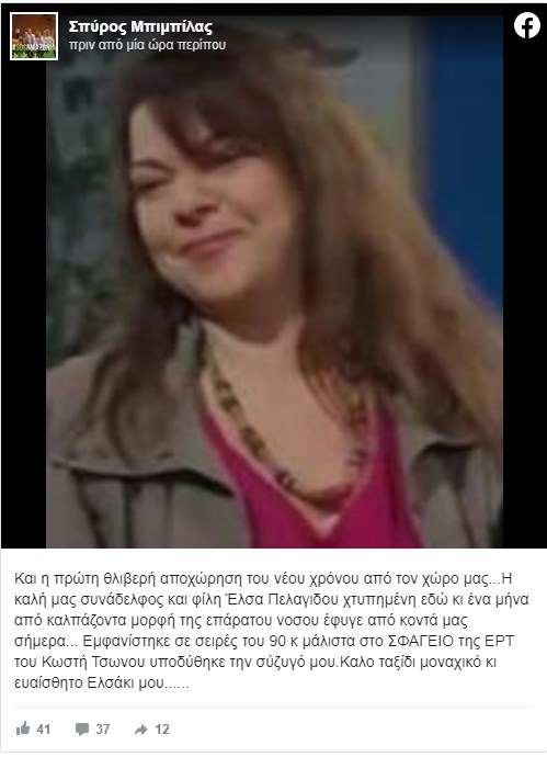 Τη δυσάρεστη είδηση ανακοίνωσε ο Σπύρος Μπιμπίλας, μέσα από το προσωπικό του προφίλ στο facebook, γράφοντας χαρακτηριστικά: «Και η πρώτη θλιβερή αποχώρηση του νέου χρόνου από τον χώρο μας…Η καλή μας συνάδελφος και φίλη Έλσα Πελαγίδου χτυπημένη εδώ κι ένα μήνα από καλπάζοντα μορφή της επάρατου νόσου έφυγε από κοντά μας σήμερα… Εμφανίστηκε σε σειρές του 90 κ μάλιστα στο ΣΦΑΓΕΙΟ της ΕΡΤ του Κωστή Τσώνου υποδύθηκε την σύζυγό μου. Καλό ταξίδι μοναχικό κι ευαίσθητο Ελσάκι μου……».