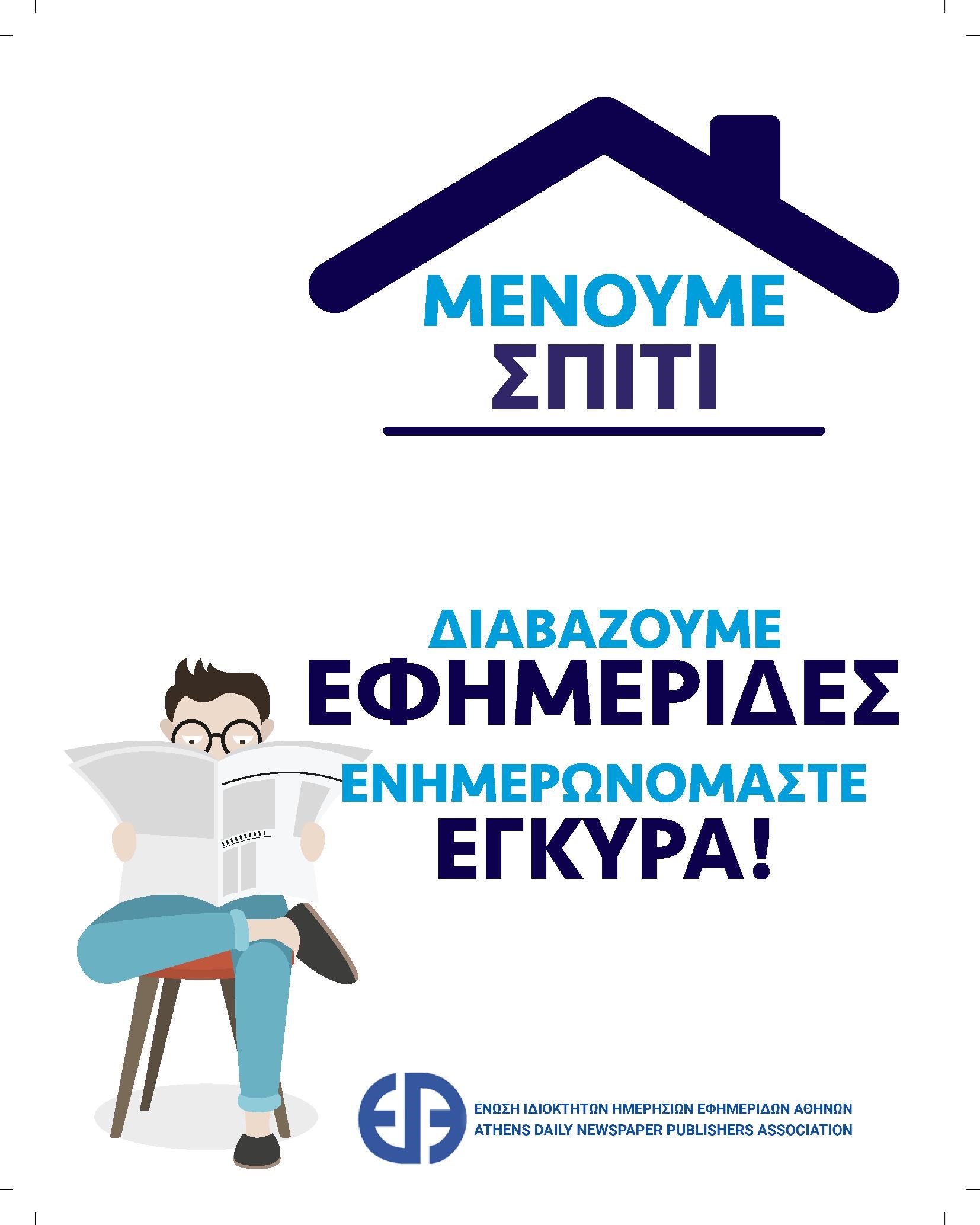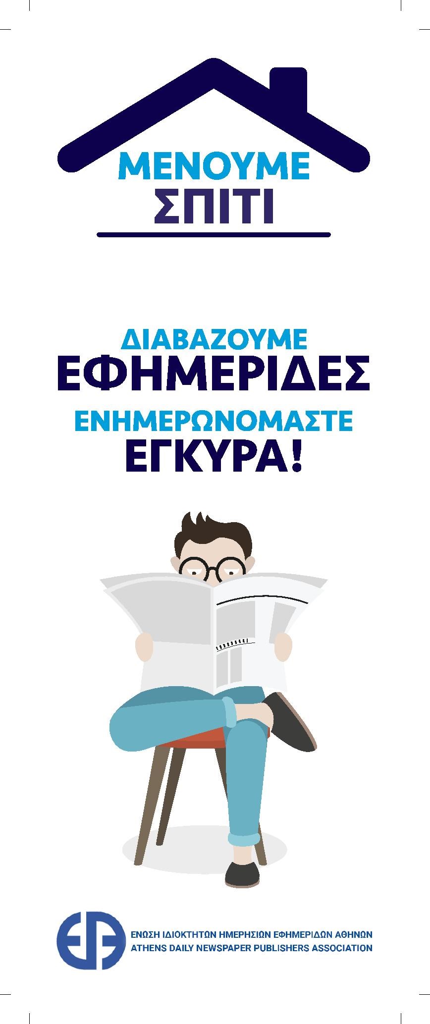 Η Ένωση Ιδιοκτητών Ημερήσιων Εφημερίδων Αθηνών συμβάλλει στην καμπάνια του υπουργείου Υγείας για την αποτροπή εξάπλωσης του κορονοϊού στη χώρα μας. ‘Μένουμε σπίτι. Διαβάζουμε εφημερίδες και ενημερωνόμαστε έγκυρα”, είναι το μήνυμα που στέλνει η ΕΙΗΕΑ.