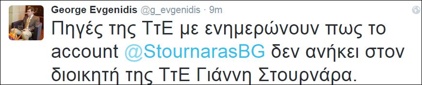 «Πηγές της ΤτΕ με ενημερώνουν πως το account @StournarasBG δεν ανήκει στον διοικητής της ΤτΕ Γιάννη Στουρνάρα», έγραψε στο twitter ο δημοσιογράφος.
