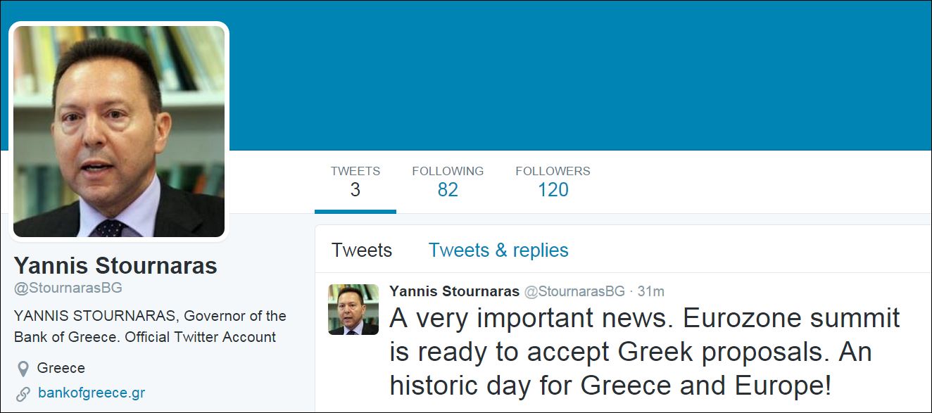 Σύγχυση έχει προκληθεί από το πρωί όταν έκανε την εμφάνισή του ένας λογαριασμός στο twitter που φαίνεται να ανήκει στον διοικητή της Τράπεζας της Ελλάδας, Γιάννης Στουρνάρας.
