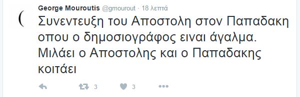 Ο Γιώργος Μουρούτης σχολίασε στο twitter παρακολουθώντας την εκπομπή “Καλημερά Ελλάδα”: “Συνέντευξη του Αποστόλη στον Παπαδάκη, όπου ο δημοσιογράφος είναι άγαλμα. Μιλάει ο Αποστόλης και ο Παπαδάκης κοιτάει”.