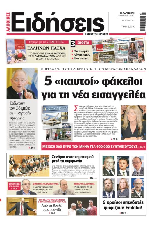 Με τίτλο «Πέντε ‘‘καυτοί’’ φάκελοι για τη νέα εισαγγελέα» κυκλοφορεί η εφημερίδα «Ειδήσεις» του Σαββατοκύριακου, του Real Group, με την υπογραφή του Νίκου Χατζηνικολάου.Η εφημερίδα αποκαλύπτει τις προτεραιότητες της Ελένης Τουλουπάκη στη διερεύνηση των μεγάλων σκανδάλων, που αφορούν την προμήθεια των αρμάτων μάχης τύπου Leopard, τα ακίνητα του Γιάννου Παπαντωνίου, τη Novartis, την Πανγαία, καθώς και αυτές για τα δάνεια της Attica Bank, της Αγροτικής και της Marfin. Στις «Ειδήσεις» μπορείτε ακόμη να διαβάσετε:Σενάρια ανασχηματισμού μετά τη συμφωνία.Στέλνουν τον Σόιμπλε σε «χρυσή» εφεδρεία.Αποκαλυπτικές συνεντεύξεις του ευρωβουλευτή του ΣΥΡΙΖΑ Δημήτρη Παπαδημούλη, που εκτιμά ότι «η κυβέρνηση πρέπει να τρέξει περισσότερο, με νέα πρόσωπα», και του διευθυντή του γραφείου τύπου της Νέας Δημοκρατίας Μακάριου Λαζαρίδη, που δηλώνει ότι «φοβόμαστε να μη σκάσει η χώρα στα χέρια τους».Ρεπορτάζ για το πόσο θα χάσουν με τα νέα μέτρα 900.000 συνταξιούχοι.Ποιοι είναι οι ξένοι κροίσοι-επιχειρηματίες που επενδύουν στην Ελλάδα.Ποιος Έλληνας βουλευτής πρωταγωνιστεί στο θεατρικό σανίδι.