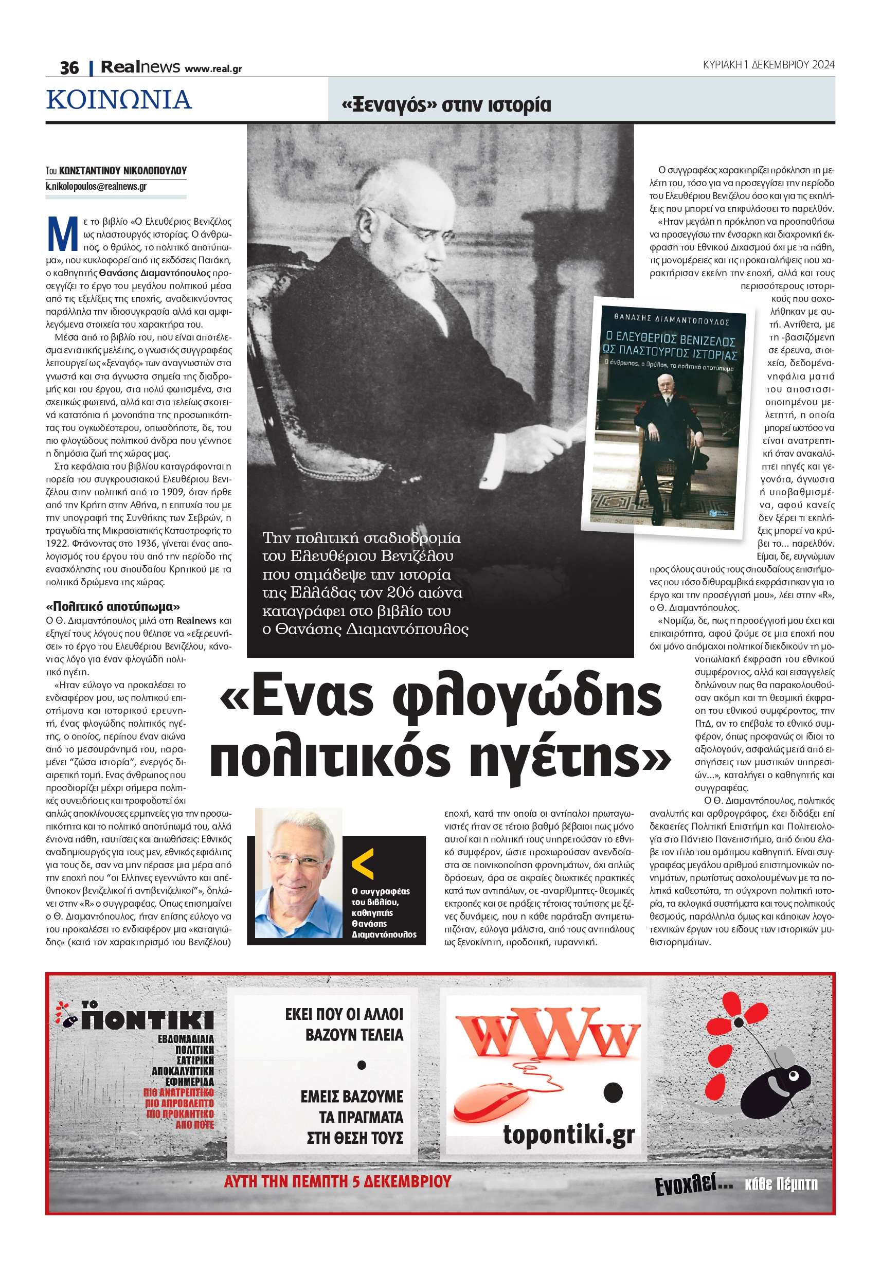 Ο Θ. Διαμαντόπουλος μιλά στη Realnews και εξηγεί τους λόγους που θέλησε να «εξερευνήσει» το έργο του Ελευθέριου Βενιζέλου, κάνοντας λόγο για έναν φλογώδη πολιτικό ηγέτη.
