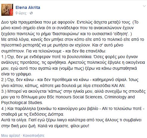Απάντηση στις φήμες που την ήθελαν να κατεβαίνει υποψήφια στις εκλογές δίνει μέσω Facebook η Έλενα Ακρίτα.