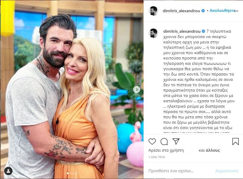 Το μοντέλο Δημήτρης Αλεξάνδρου “7 τηλεοπτικά χρόνια δεν μπορούσα να σκεφτώ καλύτερη αρχή για ‘μένα στην τηλεοπτική ζωή μου … η τα εφηβικά μου χρόνια που καθόμουνα και σε κοιτούσα μπροστά από την τηλεόραση και έλεγα πωωωωωω τι γυναικάρα θεέ μουυ πόσο θέλω να την δω από κοντά. Όταν πέρασαν τα χρόνια και ήρθα καλεσμένος σε ‘σένα δεν το πίστευα το όνειρο μου έγινε πραγματικότητα όταν με κοίταξες στα μάτια τα ‘χασα όσοι σε ξέρουν με καταλαβαίνουν … έχασα τα λόγια μου … ηλεκτρικό ρεύμα με διαπέρασε πέρασα το πρώτο σοκ….. αλλά αυτό που θα πω μετά από τόσα χρόνια που σε ξέρω με μεγάλη βεβαιότητα είναι ότι όσοι γοητεύονται με το λεξω σου που να γνωρίσουν και το μέσα σου … σε ευχαριστώ πολύ για όλα”.
