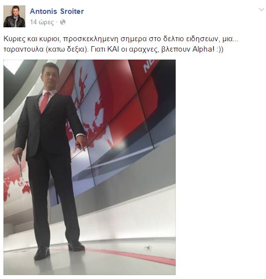 Ο παρουσιάστης ψύχραιμος την έβγαλε φωτογραφία την οποία ανέβασε στο Facebook. “Κυρίες και κύριοι, προσκεκλημένη σήμερα στο δελτίο ειδήσεων, μια… ταραντούλα (κάτω δεξιά). Γιατί ΚΑΙ οι αράχνες, βλέπουν Alpha! :))» έγραψε ο δημοσιογράφος.