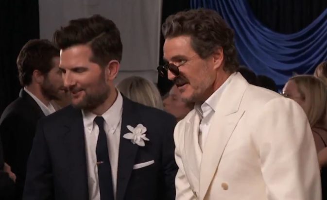Another angle of Pedro Pascal and Adam Scott on the Emmy’s red carpet