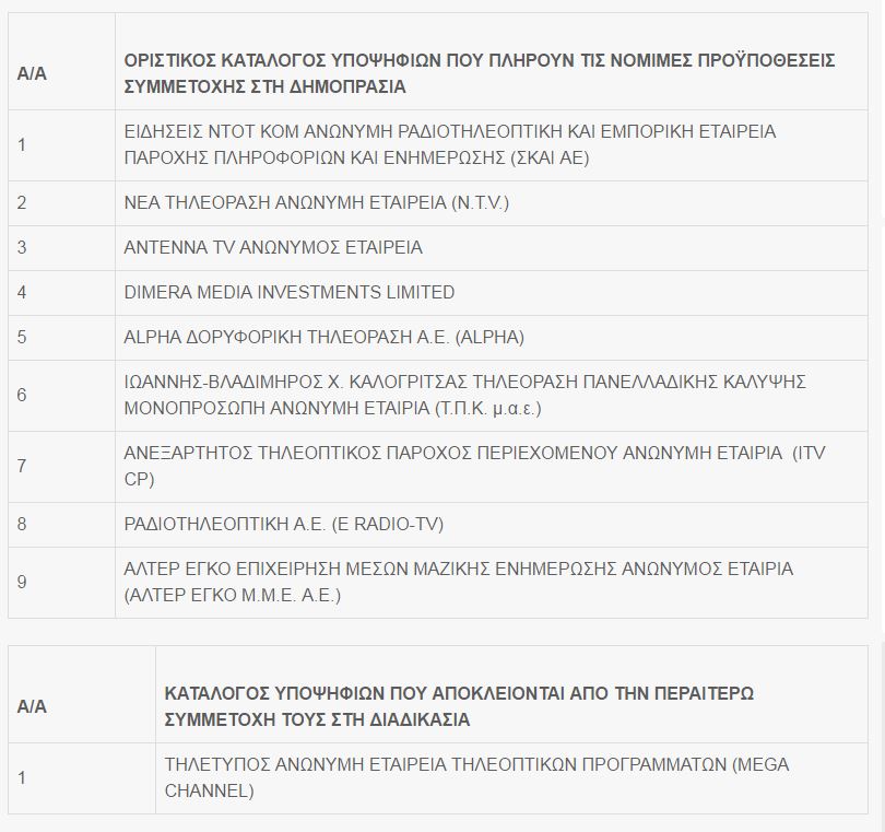 Η τελική λίστα προέκυψε μετά από τις ενστάσεις και τις αιτήσεις θεραπείας στην αρμόδια επιτροπή της Γενικής Γραμματείας Ενημέρωσης όπου και «κόπηκε» οριστικά το Mega, ενώ έγιναν αποδεκτές οι αιτήσεις θεραπείας της Dimera Media ltd (Σαββίδης) και της Ανεξάρτητος Πάροχος.