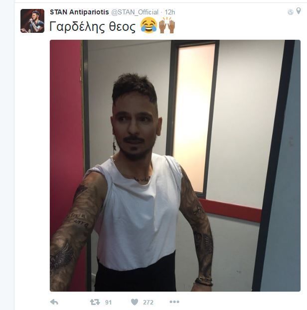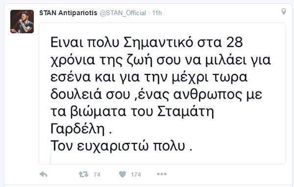 Αρχικά δημοσίευσε μία φωτογραφία του Σταμάτη Γαρδέλη σχολιάζοντας: “Γαρδέλης Θεός”, ενώ στη συνέχεια ήρθε και το μήνυμά του στον προσωπικό του λογαριασμό στο twitter: