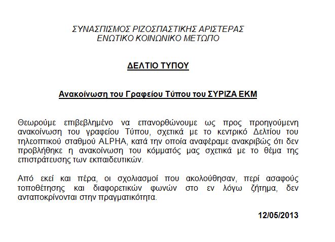 «Θεωρούμε επιβεβλημένο να επανορθώνουμε ως προς προηγούμενη ανακοίνωση του γραφείου Τύπου, σχετικά με το κεντρικό Δελτίου του τηλεοπτικού σταθμού ALPHA, κατά την οποία αναφέραμε ανακριβώς ότι δεν προβλήθηκε η ανακοίνωση του κόμματός μας σχετικά με το θέμα της επιστράτευσης των εκπαιδευτικών», αναφέρει σε ανακοίνωση που εξέδωσε πριν από λίγο ο ΣΥΡΙΖΑ και προσθέτει: