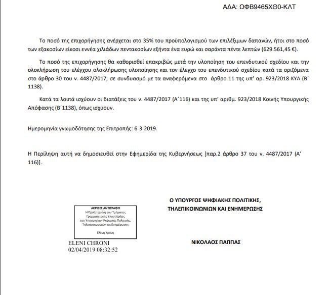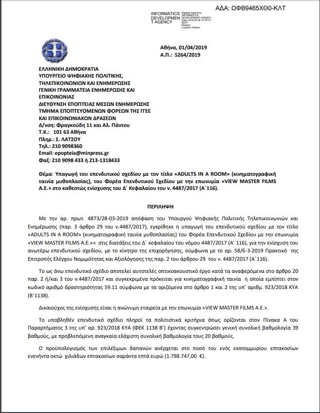Επιχορήγηση ύψους σχεδόν 630.000 ευρώ για την κινηματογραφική μεταφορά του βιβλίου του Γιάνη Βαρουφάκη από τον σκηνοθέτη, Κώστα Γαβρά ενέκρινε ο υπουργός Ψηφιακής Πολιτικής, Νίκος Παππάς.Βασισμένη στο βιβλίο του πρώην υπουργού Οικονομικών, η ταινία με τίτλο «Ενήλικοι στο δωμάτιο» περιγράφει τα όσα συνέβησαν το 2015 όταν η χώρα κατέρρευσε οικονομικά.Τον Γιάνη Βαρουφάκη στην ταινία υποδύεται ο Χρήστος Λούλης και τον Αλέξη Τσίπρα ο Αλέξανδρος Μπουρδούμης.Δείτε το έγγραφο που δημοσιεύθηκε στη Διαύγεια: