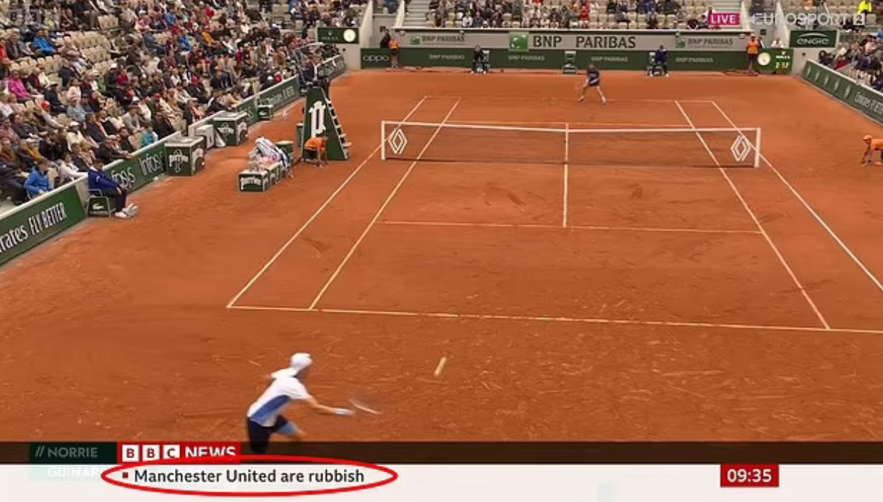 Άναυδοι έμειναν θεατές του BBC όταν παρακολουθώντας αγώνα τένις, στις 9.35 το πρωί της Τρίτης, είδαν στην οθόνη τους το μήνυμα “η Μάντσεστερ Γιουνάιτεντ είναι σκουπίδι” και πως σήμερα το πρωί “βρέχει παντού”.