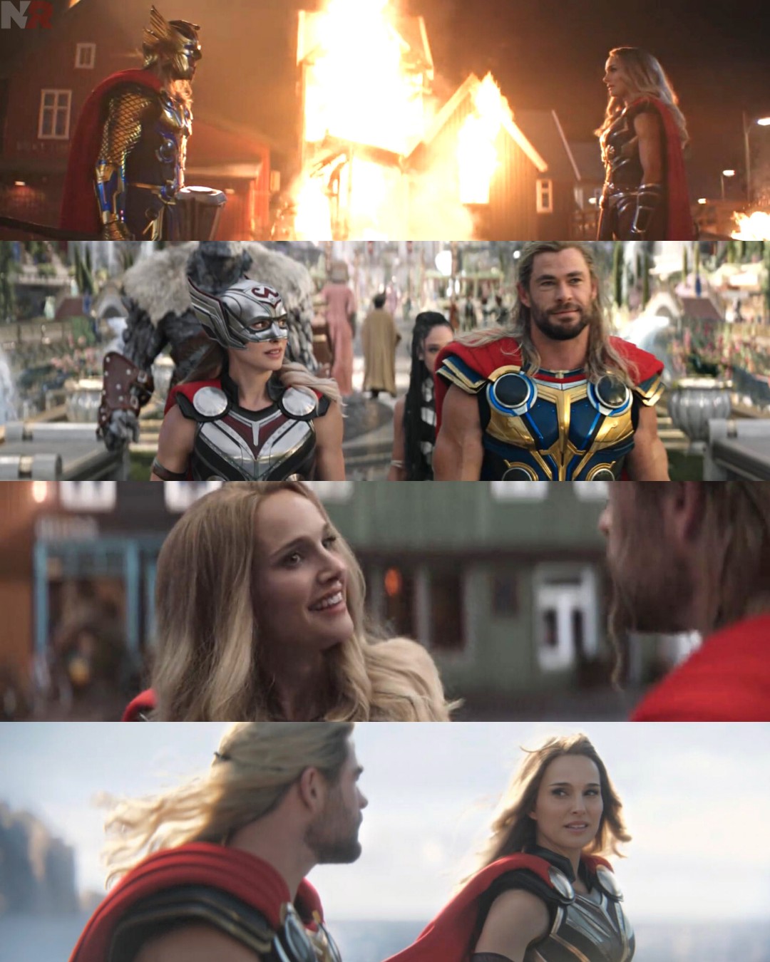 Στο τρέιλερ υπάρχουν νέα πλάνα από τη Jane Foster (Νάταλι Πόρτμαν), η οποία κραδαίνει το μαγικό σφυρί, το Mjolnir, ως Mighty Thor, και από τον Θεό Δία, τον οποίο ενσαρκώνει ο Ράσελ Κρόου.