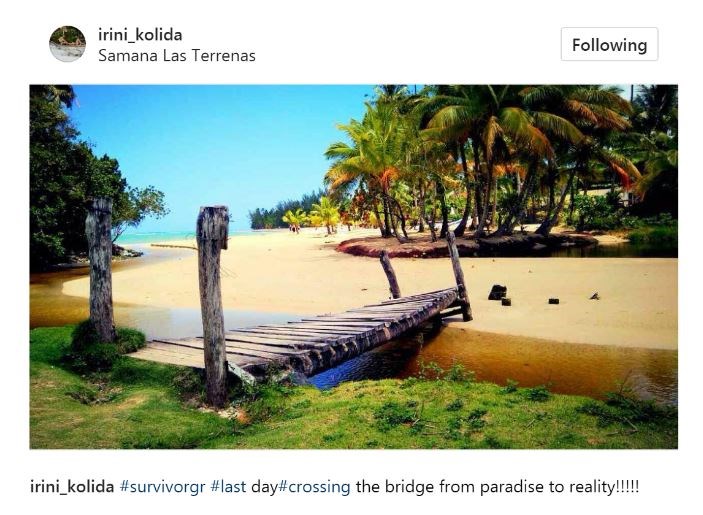 Μπορεί η Ειρήνη Κολιδά, μετά το ατύχημα που είχαν οι “Μαχητές” του Survivor να έχει αποχωρήσει από το παιχνίδι, αυτό όμως δεν σημαίνει ότι έχει φύγει και από τον Άγιο Δομίνικο.Η 34χρονη personal trainer, η οποία τραυματίστηκε πιο σοβαρά από όλους, έχει πάρει εξιτήριο από το νοσοκομείο. Μέχρι όμως να αναρρώσει και να έρθει η κατάλληλη στιγμή, όπου θα μπορεί να κάνει το μεγάλο ταξίδι προς την Ελλάδα, είχε την δυνατότητα να απολαύσει τις μαγευτικές παραλίες του Άγιου Δομίνικου.Μάλιστα σήμερα, ανέβασε μια φωτογραφία στο προσωπικό της λογαριασμό στο Instagram, που δείχνει ότι περνάει πολύ όμορφα αλλά και ότι μάλλον ήρθε η ώρα να φύγει από το εξωτικό νησί.”#survivorgr #lastday #crossing the bridge from paradise to reality!!!!!”, έγραψε χαρακτηριστικά στη λεζάντα που την συνόδευε, αφήνοντας έτσι να εννοηθεί πως σήμερα είναι η τελευταία μέρα της εκεί.Δείτε την ανάρτηση: