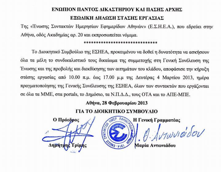 «Το Διοικητικό Συμβούλιο της ΕΣΗΕΑ, προκειμένου να δοθεί η δυνατότητα να ασκήσουν όλα τα μέλη το συνδικαλιστικό τους δικαίωμα της συμμετοχής στη Γενική Συνέλευση της Ένωσης και της προβολής και διεκδίκησης των αιτημάτων του κλάδου, αποφάσισε την κήρυξη στάσης εργασίας από 10.00 π.μ. έως 17.00 μ.μ της Δευτέρας 4 Μαρτίου 2013, ημέρα πραγματοποίησης της Γενικής Συνέλευσης της ΕΣΗΕΑ, όλων των συντακτών που εργάζονται σε όλα τα ΜΜΕ, στα portals, το Δημόσιο, τα Ν.Π.Δ.Δ., τους ΟΤΑ και το ΑΠΕ-ΜΠΕ».