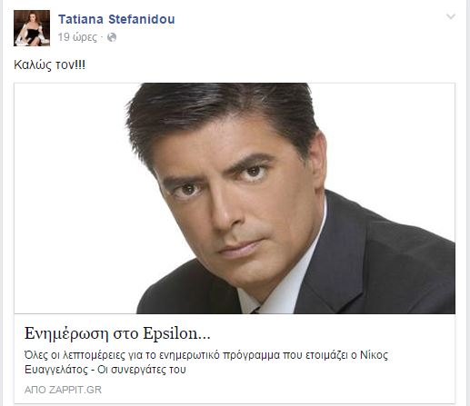 Η Τατιάνα Στεφανίδου που παρουσιάζει την εκπομπή «Tatiana live» στο Epsilon, θέλοντας να υποδεχτεί τον σύζυγό της, Νίκο Ευαγγελάτο, στο νέο του κανάλι, δημοσίευσε στον προσωπικό της λογαριασμό στο Facebook την επίσημη ανακοίνωση που εξέδωσε το Epsilon για εκείνον, σχολιάζοντας «Καλώς τον!».