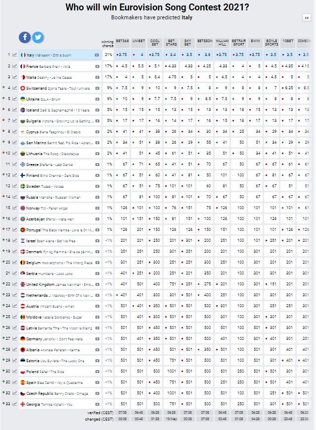 Σύμφωνα με τα γραφεία στοιχημάτων νικήτρια της φετινής Eurovision φαίνεται πως θα αναδειχθεί η Ιταλία με τους Maneskin το τραγούδι “Zitti e buoni”. Σύμφωνα με τις στοιχηματικές εταιρείες στη δεύτερη θέση είναι η Γαλλία με το τραγούδι “Voilà” και στην τρίτη η Μάλτα με το “Je Me Casse”. Στην εντέκατη θέση βρίσκεται αυτή τη στιγμή η Ελλάδα με το “Last Dance” και στην όγδοη η Κύπρος με την Έλενα Τσαγκρινού και το τραγούδι “El Diablo”. Υπενθυμίζεται ότι η Κύπρος διαγωνίστηκε στον πρώτο ημιτελικό που πραγματοποιήθηκε την Τρίτη και πέρασε στον τελικό΄.