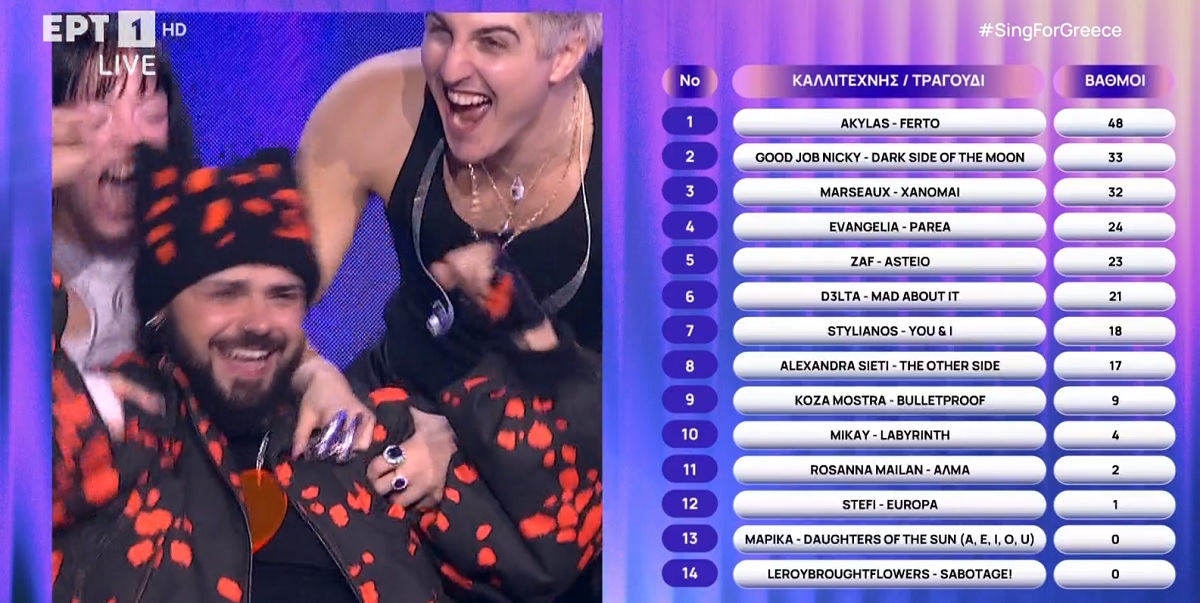 Γνωστός έγινε ο τραγουδιστής που θα εκπροσωπήσει τη χώρα μας στον μουσικό διαγωνισμό της Eurovision τον Μάη στη Βιέννη. Είναι ο Akylas, που επιβεβαίωσε όλα τα στοιχήματα και τα προγνωστικά που τον έφερναν φαβορί. Ο τραγουδιστής με το δυναμικό dance τραγούδι «Ferto», που έχει γίνει ήδη viral, σάρωσε όχι μόνο στο κοινό, αλλά και στις κριτικές επιτροπές, καθώς τόσο η διεθνής επιτροπή όσο και η ελληνική του έδωσε τους 12 βαθμούς και πήρε έτσι το «χρυσό» εισιτήριο για την Eurovision.