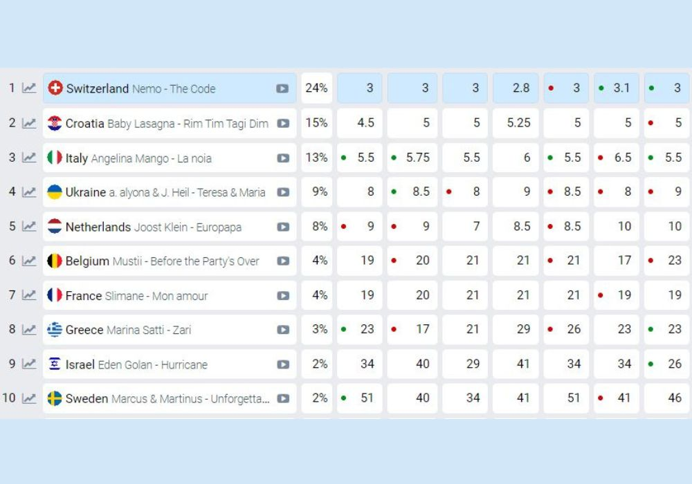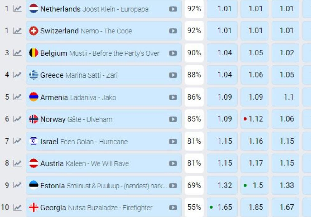 Η Ελλάδα, αν και έχασε μία θέση, συνεχίζει να βρίσκεται ψηλά στον πίνακα των στοιχημάτων αναφορικά με το ποιος θα είναι ο νικητής της τελικής βραδιάς (8η θέση). Επίσης, στους πίνακες οι οποίοι προβλέπουν ποιες 10 χώρες θα πάρουν τα εισιτήρια από τους ημιτελικούς, η Ελλάδα βρίσκεται στην 4η θέση του συγκεκριμένου πίνακα με τις πιθανότητες για να βρεθούμε στην τελική βραδιά να αγγίζουν το 90%!