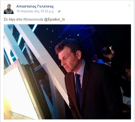 Ο Απόστολος Γκλέτσος ήταν καλεσμένος στην πρεμιέρα της Ρούλας Κορομηλά. Ο δήμαρχος Στυλίδας είχε μάλιστα ποστάρει στο facebook μία φωτογραφία του στα παρασκήνια του σόου “Μπράβο Ρούλα”.