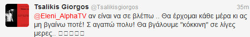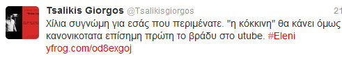 Ο Γιώργος Τσαλίκης ήταν σήμερα προσκεκλημένος στην εκπομπή της Ελένης Μενεγάκη, για να …ρίξει “κόκκινη” – ή αλλιώς, για να παρουσιάσει το καινούργιο του τραγούδι, με τίτλο “Κόκκινη κάρτα”. H αλήθεια είναι ότι τη συγκεκριμένη εμφάνιση, την περίμενε πώς και πώς ο δημοφιλής τραγουδιστής, και μάλιστα, την είχε προαναγγείλει στους χιλιάδες φίλους του και followers του λογαριασμού του στο twitter. .Πράγματι, ο Γιώργος πήγε στο πλατό του “Ελένη”, δεν βγήκε όμως ποτέ στον αέρα! Τι συνέβη; Μην πάει ο νους σας στο κακό…Απλώς, το θέμα Eurovision απορρόφησε την Ελένη και τις καλεσμένες της και …”τραγάνισε” το χρόνο της εκπομπής. Τι έγραψαν ο Γιώργος και η Ελένη στο twitter τους;