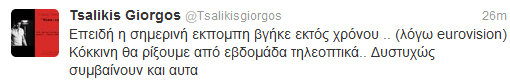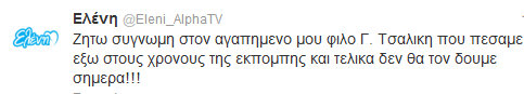 Ο Γιώργος Τσαλίκης ήταν σήμερα προσκεκλημένος στην εκπομπή της Ελένης Μενεγάκη, για να …ρίξει “κόκκινη” – ή αλλιώς, για να παρουσιάσει το καινούργιο του τραγούδι, με τίτλο “Κόκκινη κάρτα”. H αλήθεια είναι ότι τη συγκεκριμένη εμφάνιση, την περίμενε πώς και πώς ο δημοφιλής τραγουδιστής, και μάλιστα, την είχε προαναγγείλει στους χιλιάδες φίλους του και followers του λογαριασμού του στο twitter. .Πράγματι, ο Γιώργος πήγε στο πλατό του “Ελένη”, δεν βγήκε όμως ποτέ στον αέρα! Τι συνέβη; Μην πάει ο νους σας στο κακό…Απλώς, το θέμα Eurovision απορρόφησε την Ελένη και τις καλεσμένες της και …”τραγάνισε” το χρόνο της εκπομπής. Τι έγραψαν ο Γιώργος και η Ελένη στο twitter τους;