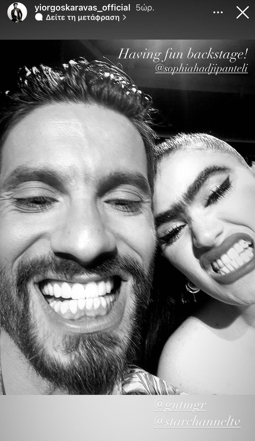 Πρόκειται για μια selfie του με την Σοφία Χατζηπαντελή. «Διασκεδάζοντας στα backstage», έγραψε στο στόρι που ανέβασε στον προσωπικό του λογαριασμό στο Intsagram ο Γιώργος Καράβας.