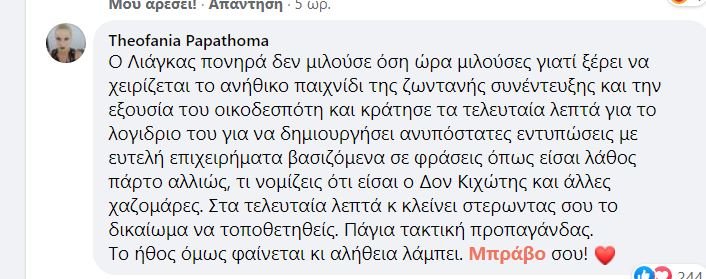 “Ο Λιάγκας πονηρά δεν μιλούσε όση ώρα μιλούσες γιατί ξέρει να χειρίζεται το ανήθικο παιχνίδι της ζωντανής συνέντευξης και την εξουσία του οικοδεσπότη και κράτησε τα τελευταία λεπτά για το λογύδριο του για να δημιουργήσει ανυπόστατες εντυπώσεις με ευτελή επιχειρήματα βασιζόμενα σε φράσεις όπως είσαι λάθος παρ’ το αλλιώς, τι νομίζεις ότι είσαι ο Δον Κιχώτης και άλλες χαζομάρες. Στα τελευταία λεπτά και κλείνει στερώντας σου το δικαίωμα να τοποθετηθείς. Πάγια τακτική προπαγάνδας. Το ήθος όμως φαίνεται κι αλήθεια λάμπει. Μπράβο σου” έγραψε η ηθοποιός.