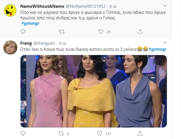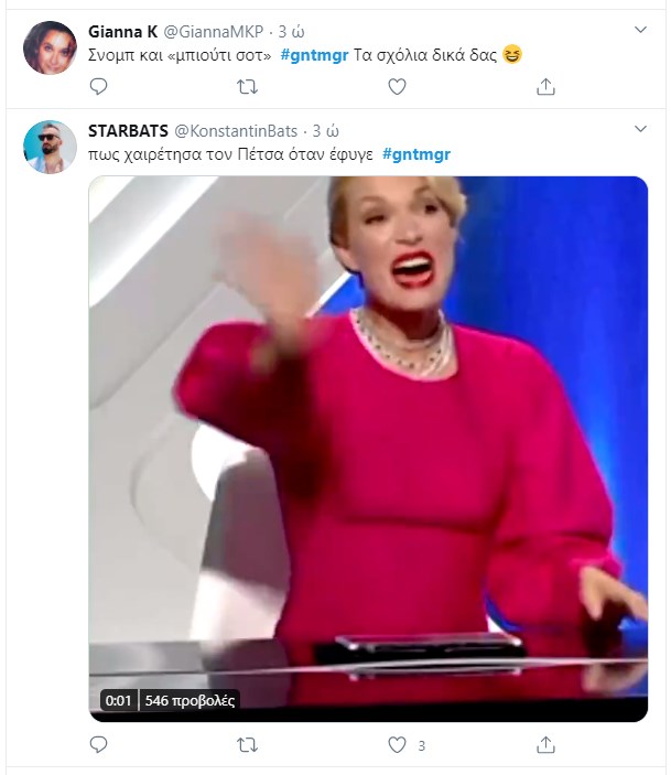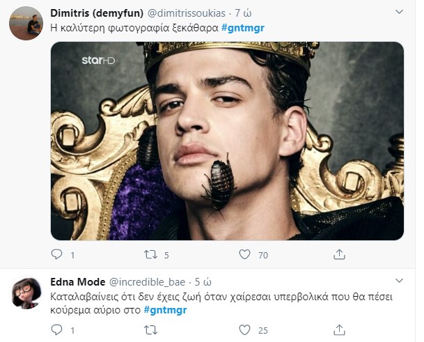 “Πάρτι” έγινε στο Twitterμε το χθεσινό επεισόδιο του GNTM. Μετά τη δοκιμασία με τις κατσαρίδες Μαδαγασκάρης, τα σκουλήκια και τα σαλιγγάρια, οι παίκτες βρέθηκαν αντιμέτωποι με μια ακόμη αποχώρηση. Όμως το Twitter δεν συμφώνησε με την ανατροπή στην αποχώρηση, καθώς το “αντίο” είπε ο Παναγιώτης Πέτσας. Σύμφωνα με τους χρήστες θα έπρεπε να αποχωρήσει ο “γύπας” στη θέση του.