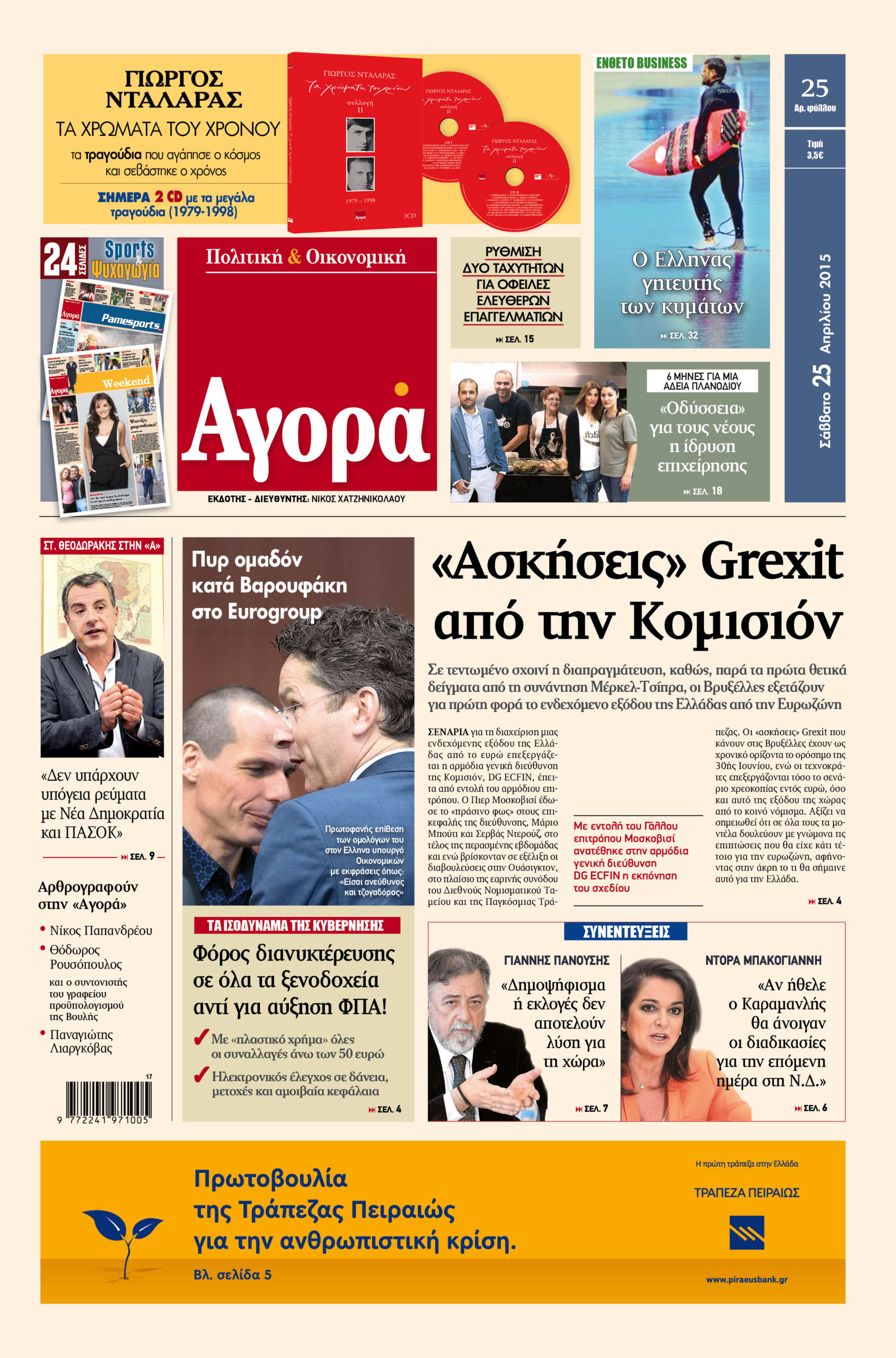 Με τίτλο «”Aσκήσεις” Grexit από την Κομισιόν» κυκλοφορεί σήμερα η «Αγορά». Η εφημερίδα αποκαλύπτει ότι η διαπραγμάτευση με τους δανειστές βρίσκεται σε τεντωμένο σχοινί, καθώς, παρά τα πρώτα θετικά δείγματα από τη συνάντηση Μέρκελ-Τσίπρα, οι Βρυξέλλες εξετάζουν για πρώτη φορά το ενδεχόμενο εξόδου της Ελλάδας από την Ευρωζώνη.