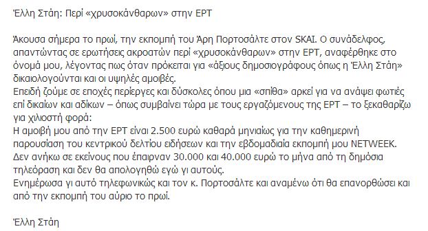 Η Έλλη Σταή μέσω Facebook απαντά στα περί “χρυσοκάνθαρων” και αποκαλύπτει την αμοιβή της.
