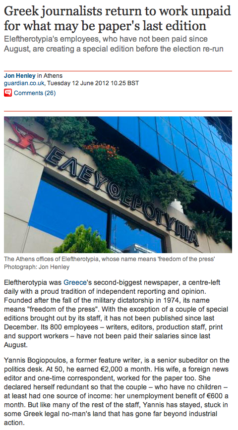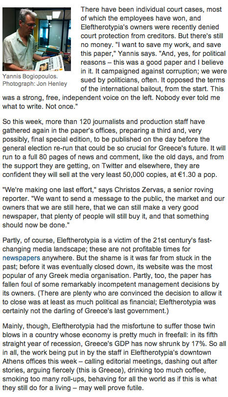 Η αγγλική εφημερίδα “The Guardian” με εκτενές της άρθρο αναφέρεται στην “Ελευθεροτυπία” και στον αγώνα που κάνουν οι εργαζόμενοι για να βγάλουν το τρίτο τους απεργιακό φύλλο.Ο τίτλος του αγγλικού άρθρου είναι : “Έλληνες δημοσιογράφοι επιστρέφουν στη δουλειά απλήρωτοι, γι’ αυτό που μπορεί να είναι η τελευταία έκδοση της εφημερίδας”.Το άρθρο ξεκινάει με την ιστορία της εφημερίδας: ” Η Ελευθεροτυπία ήταν η δεύτερη μεγαλύτερη εφημερίδα της Ελλάδας, ένα κεντρώο αριστερό καθημερινό φύλλο, με μια υπερήφανη παράδοση τους ανεξάρτητου ρεπορτάζ και της άποψης. Ιδρύθηκε μετά την δικτατoρία του 1974 και το ονομά της σημαίνει “ελευθερία του Τύπου”. Σε κάποιο άλλο σημείο αναφέρεται ότι ” αυτή την εβδομάδα, περισσότεροι από 120 δημοσιογράφοι και εργαζόμενοι επέστρεψαν στα γραφεία για να προετοιμάσουν την τρίτη και πολύ πιθανό, την τελευταία έκδοση, που θα κυκλοφορήσει μια μέρα πριν τις εκλογές. Θα είναι μια έκδοση 80 σελίδων με νέα και σχόλια, όπως τις παλιές μέρες…”. Στο κείμενο φιλοξενούνται δηλώσεις εργαζομένων, ενώ ο αρθρογράφος Jon Henley, καταγράφει πως “η Ελευθεροτυπία είναι ένα θύμα της κρίσης που σοβεί στο διαρκώς μεταβαλλόμενο τοπίο των media στον 21ο αιώνα – σ’αυτούς τους καιρούς οι εφημερίδες δεν είναι πια επικερδείς επιχειρήσεις…”.