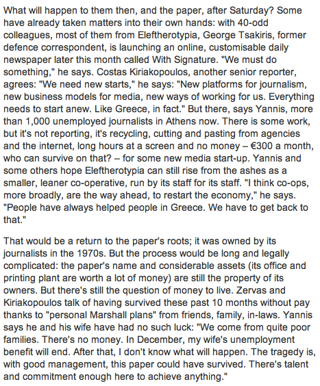 Η αγγλική εφημερίδα “The Guardian” με εκτενές της άρθρο αναφέρεται στην “Ελευθεροτυπία” και στον αγώνα που κάνουν οι εργαζόμενοι για να βγάλουν το τρίτο τους απεργιακό φύλλο.Ο τίτλος του αγγλικού άρθρου είναι : “Έλληνες δημοσιογράφοι επιστρέφουν στη δουλειά απλήρωτοι, γι’ αυτό που μπορεί να είναι η τελευταία έκδοση της εφημερίδας”.Το άρθρο ξεκινάει με την ιστορία της εφημερίδας: ” Η Ελευθεροτυπία ήταν η δεύτερη μεγαλύτερη εφημερίδα της Ελλάδας, ένα κεντρώο αριστερό καθημερινό φύλλο, με μια υπερήφανη παράδοση τους ανεξάρτητου ρεπορτάζ και της άποψης. Ιδρύθηκε μετά την δικτατoρία του 1974 και το ονομά της σημαίνει “ελευθερία του Τύπου”. Σε κάποιο άλλο σημείο αναφέρεται ότι ” αυτή την εβδομάδα, περισσότεροι από 120 δημοσιογράφοι και εργαζόμενοι επέστρεψαν στα γραφεία για να προετοιμάσουν την τρίτη και πολύ πιθανό, την τελευταία έκδοση, που θα κυκλοφορήσει μια μέρα πριν τις εκλογές. Θα είναι μια έκδοση 80 σελίδων με νέα και σχόλια, όπως τις παλιές μέρες…”. Στο κείμενο φιλοξενούνται δηλώσεις εργαζομένων, ενώ ο αρθρογράφος Jon Henley, καταγράφει πως “η Ελευθεροτυπία είναι ένα θύμα της κρίσης που σοβεί στο διαρκώς μεταβαλλόμενο τοπίο των media στον 21ο αιώνα – σ’αυτούς τους καιρούς οι εφημερίδες δεν είναι πια επικερδείς επιχειρήσεις…”.