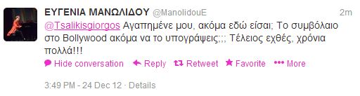 Με αφορμή τη χθεσινοβραδινή εμφάνιση ala Bollywood του Γιώργου Τσαλίκη στο “Dancing With The Stars”, η Ευγενία Μανωλίδου έστειλε ένα μήνυμα στο τραγουδιστή, που φαίνεται ότι τον ξεχωρίζει.