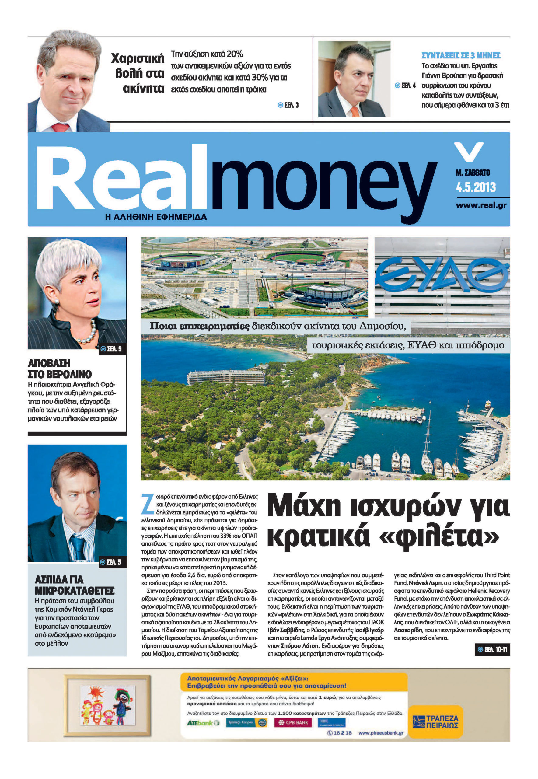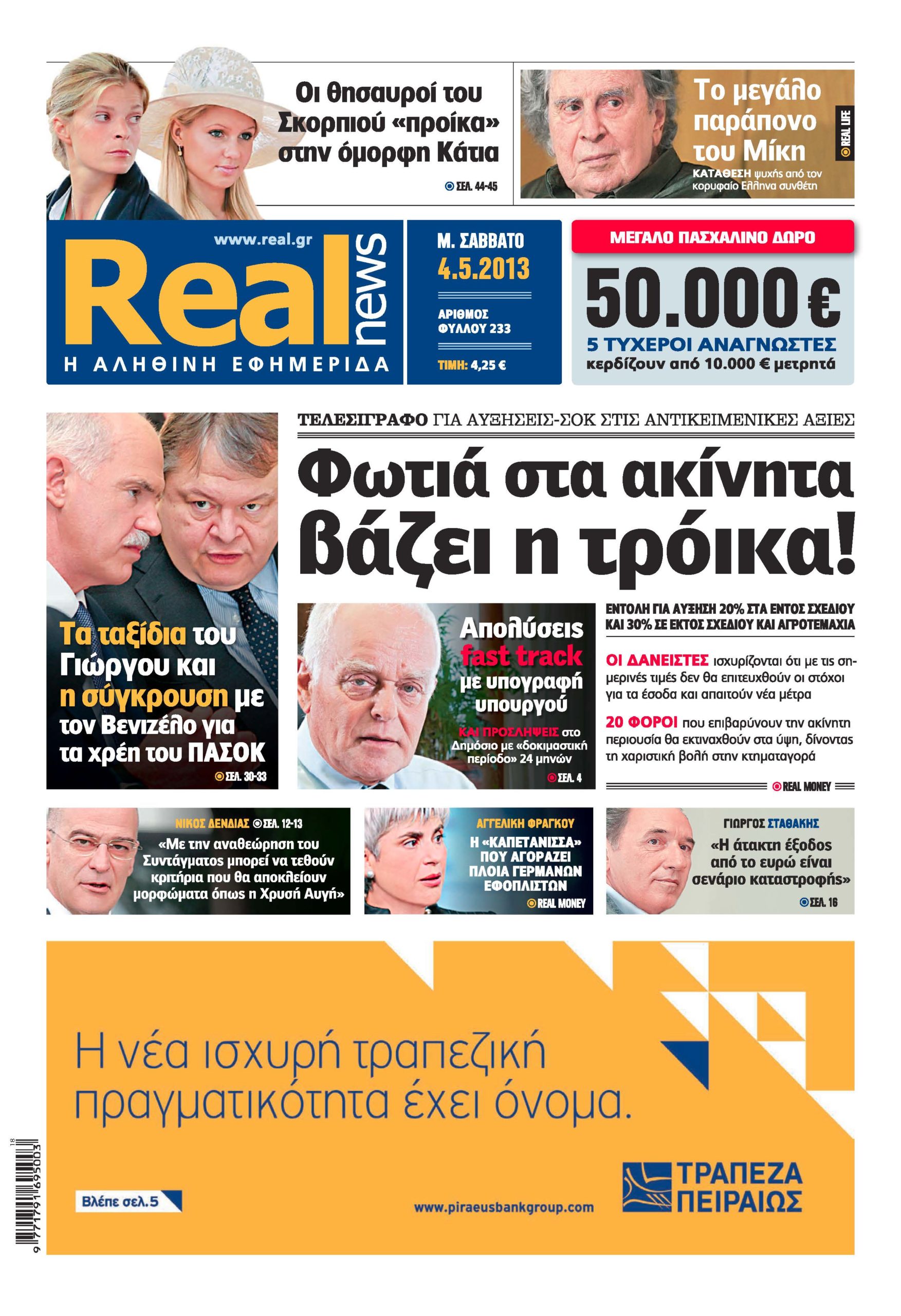 Με τίτλο: “Φωτιά στα ακίνητα βάζει η τρόικα!” κυκλοφορεί η Realnews, η οποία εκτάκτως αυτήν την εβδομάδα θα βρίσκεται στα περίπτερα έως και τη Δευτέρα του Πάσχα. Η εφημερίδα αποκαλύπτει το τελεσίγραφο για αυξήσεις-σοκ στις αντικειμενικές αξίες και την εντολή για αύξηση 20% στα εντός σχεδίου και 30% σε εκτός σχεδίου και αγροτεμάχια. Όπως αναφέρει η Realnews “οι δανειστές ισχυρίζονται ότι με τις σημερινές τιμές δεν θα επιτευχθούν οι στόχοι για τα έσοδα και απαιτούν νέα μέτρα”. Το ρεπορτάζ επισημαίνει ότι “20 φόροι που επιβαρύνουν την ακίνητη περιουσία θα εκτιναχθούν στα ύψη, δίνοντας τη χαριστική βολή στην κτηματαγορά”.