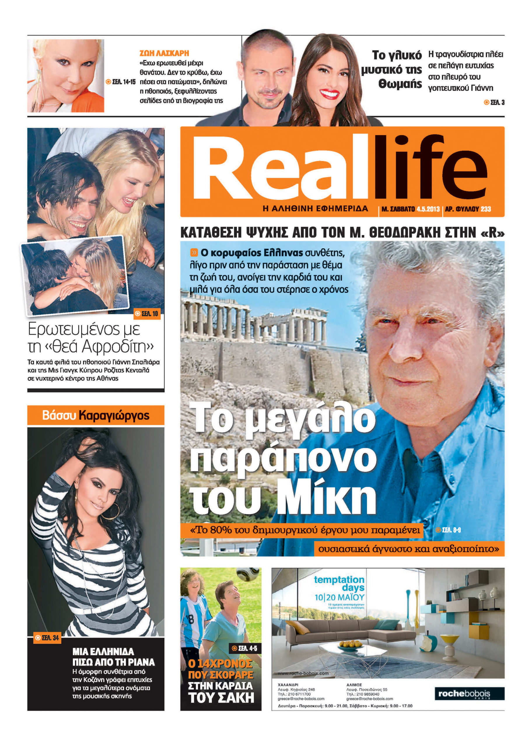 – Το μεγάλο παράπονο του Μίκη. Κατάθεση ψυχής από τον Μ. Θεοδωράκη: “Το 80% του δημιουργικού έργου μου παραμένει ουσιαστικά άγνωστο και αναξιοποίητο”. Ο κορυφαίος Έλληνας συνθέτης, λίγο πριν από την παράσταση με θέμα τη ζωή του, ανοίγει την καρδιά του και μιλά για όλα όσα του στέρησε ο χρόνος.