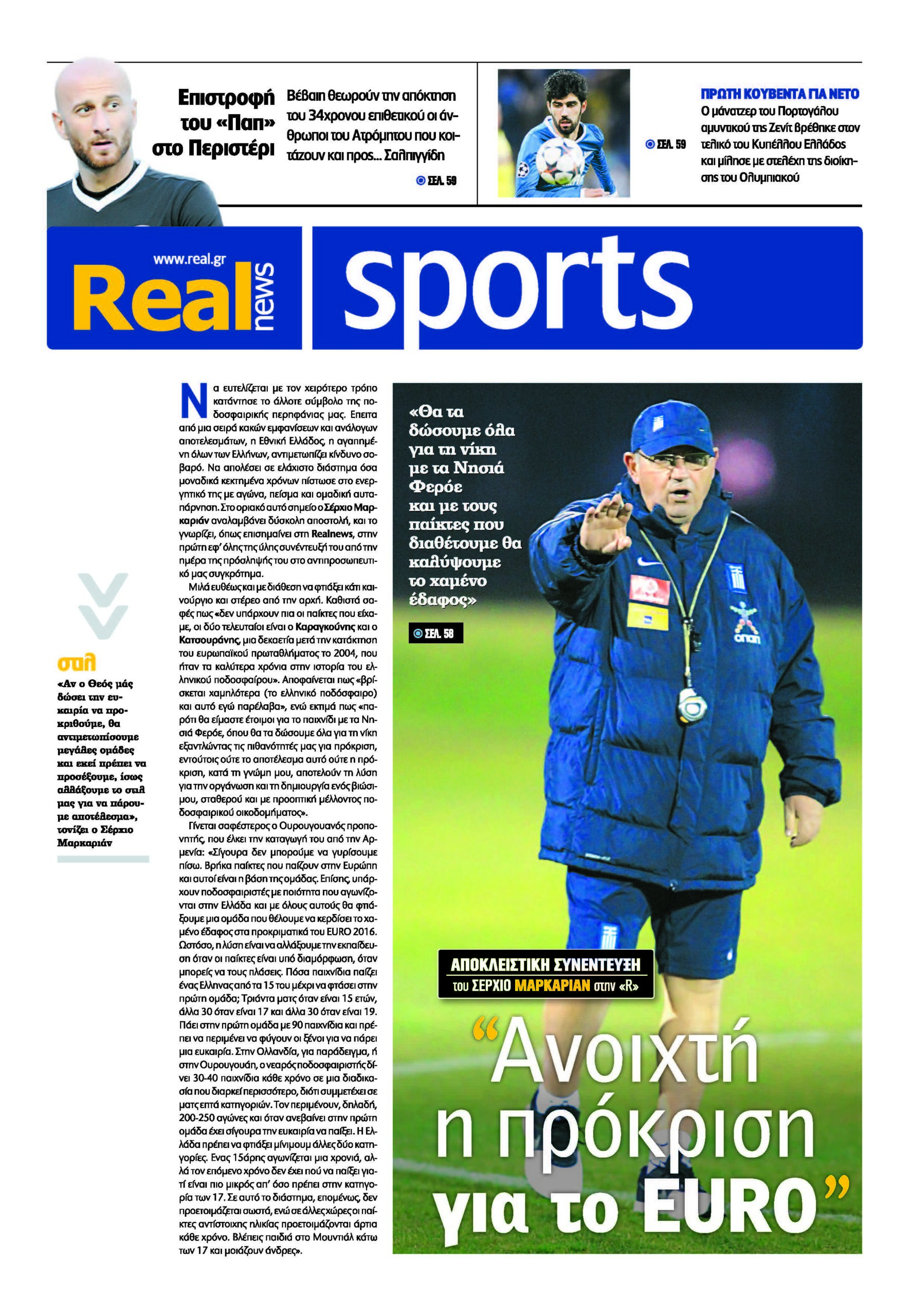 Η εφημερίδα επισημαίνει ότι “οι “θεσμοί” εκβιάζουν – η κυβέρνηση απειλεί με ρήξη” και αναφέρει ότι “στο παρά πέντε της συμφωνίας οι δανειστές τραβούν το σχοινί και απαιτούν μέτρα συνολικού ύψους 5 δισ. ευρώ”. Η Realnews σημειώνει επίσης: “Απολύσεις στο Δημόσιο, κατάργηση οργανισμών και μειώσεις μισθών περιλαμβάνει το τελεσίγραφο των πιστωτών που θα αποσταλεί στην Αθήνα εάν δεν “κλείσει” η συμφωνία”. Ακόμη η εφημερίδα δημοσιεύει πληροφορίες για το “κρίσιμο δείπνο στο Βερολίνο με “πρώτο πιάτο” την Ελλάδα”.