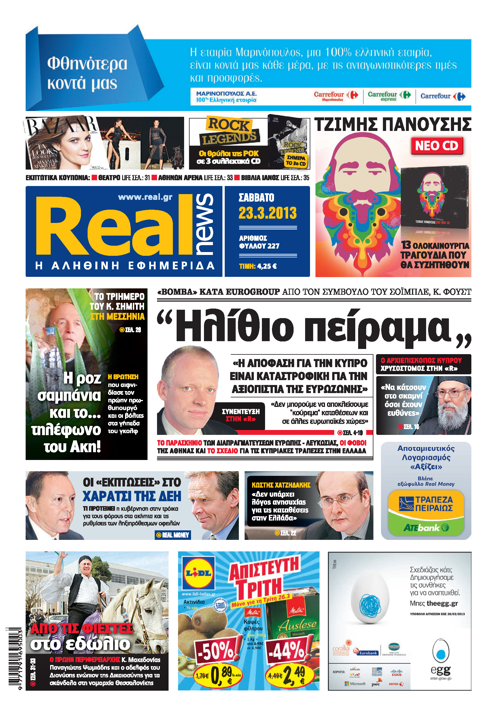 Με τίτλο: “Ηλίθιο πείραμα” κυκλοφορεί η Realnews, η οποία -εκτάκτως- αυτήν την εβδομάδα θα βρίσκεται στα περίπτερα έως και τη Δευτέρα 25 Μαρτίου. Η εφημερίδα φιλοξενεί αποκλειστική συνέντευξη του συμβούλου του Σόιμπλε, Κ. Φουστ, ο οποίος ρίχνει “βόμβες” κατά του Εurogroup λέγοντας: “Η απόφαση για την Κύπρο είναι καταστροφική για την αξιοπιστία της ευρωζώνης”, ενώ δεν διστάζει να πει: “Δεν μπορούμε να αποκλείσουμε “κούρεμα” καταθέσεων και σε άλλες ευρωπαϊκές χώρες”!